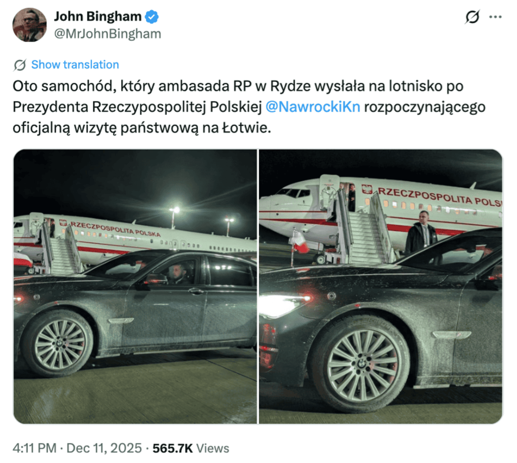 – Oto samochód, który ambasada RP w Rydze wysłała na lotnisko po Prezydenta Rzeczypospolitej Polskiej @NawrockiKn rozpoczynającego oficjalną wizytę państwową na Łotwie.