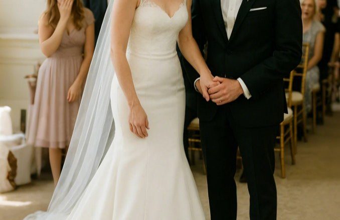 Wyglądała nieskazitelnie: jej biała suknia o kroju syreny swobodnie opadała na jej szczupłe ciało, a długi welon opadał aż do podłogi.
